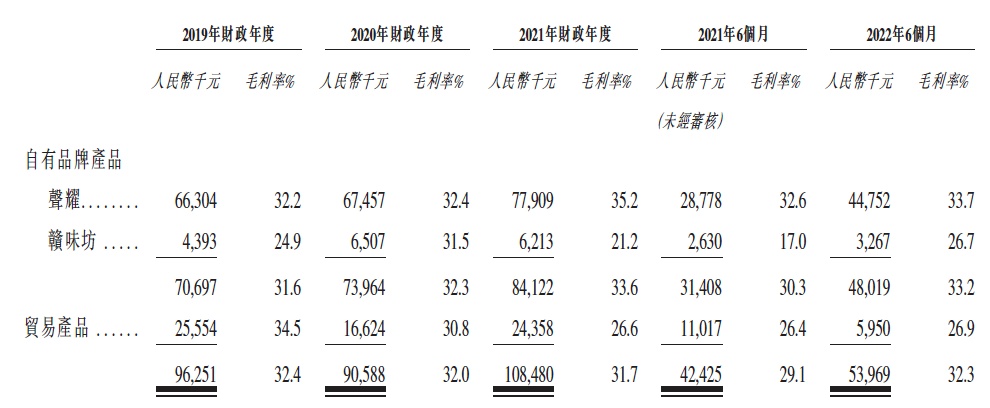 若进一步细究,不难发现正味集团较高的毛利率主要是得益于“声耀”品牌拉升了公司整体的盈利能力。报告期内,“声耀”品牌毛利率一路攀升,从2019年的32.2%提高至2022H1的33.7%。作为对比,2022H1期间,“赣味坊”的毛利率仅为26.7%,贸易产品的毛利率则为26.9%。