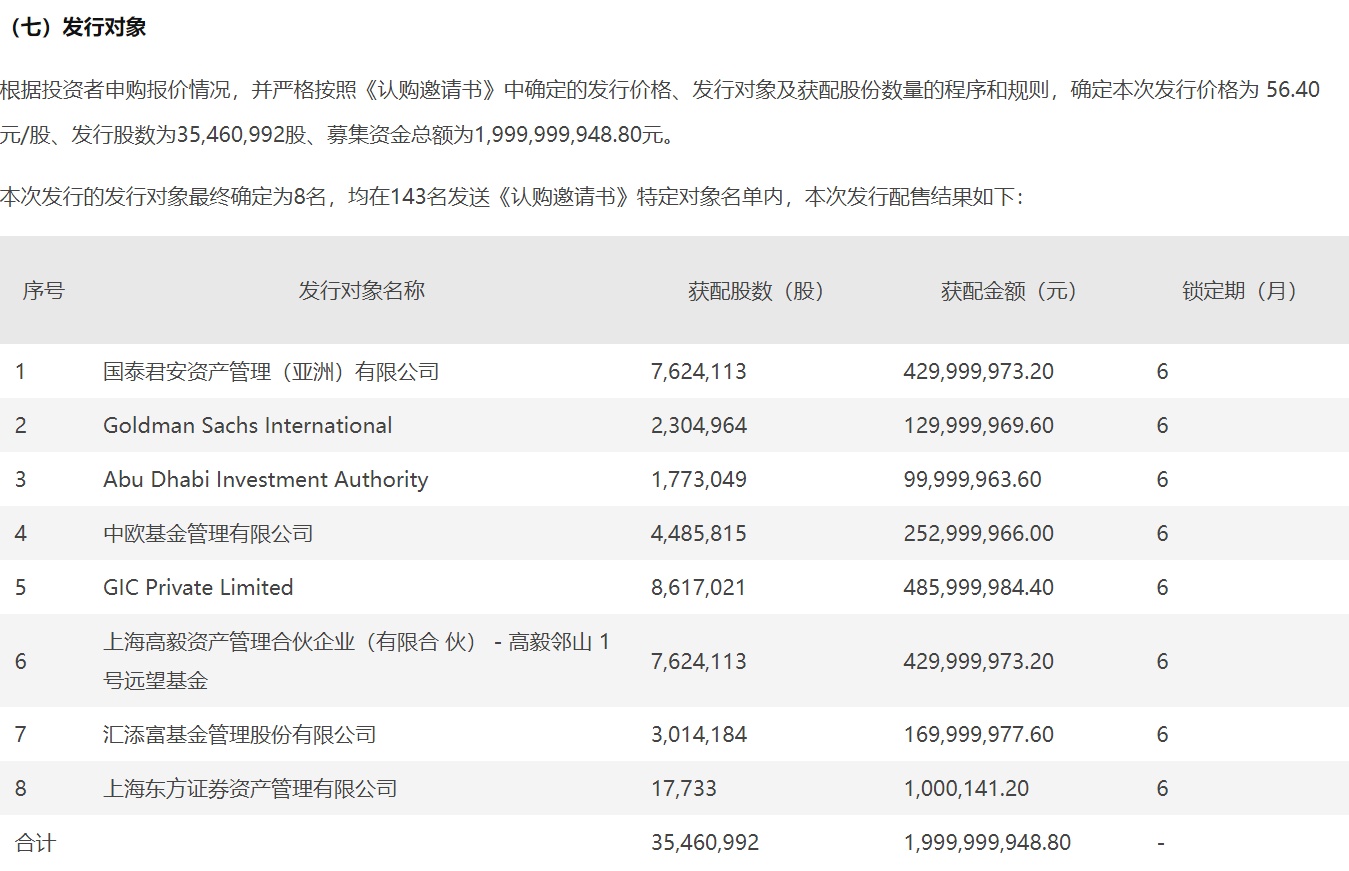 公告显示,此次发行的发行对象最终确定为8名,均在143名发送《认购邀请书》特定对象名单内,最终获配对象包括国泰君安资产管理(亚洲)有限公司、中欧基金管理有限公司、汇添富基金管理股份有限公司、上海东方证券资产管理有限公司等。其中,高毅资产冯柳管理的“上海高毅资产管理合伙企业-高毅邻山1号远望基金”获配762.41万股,获配金额约4.30亿元。