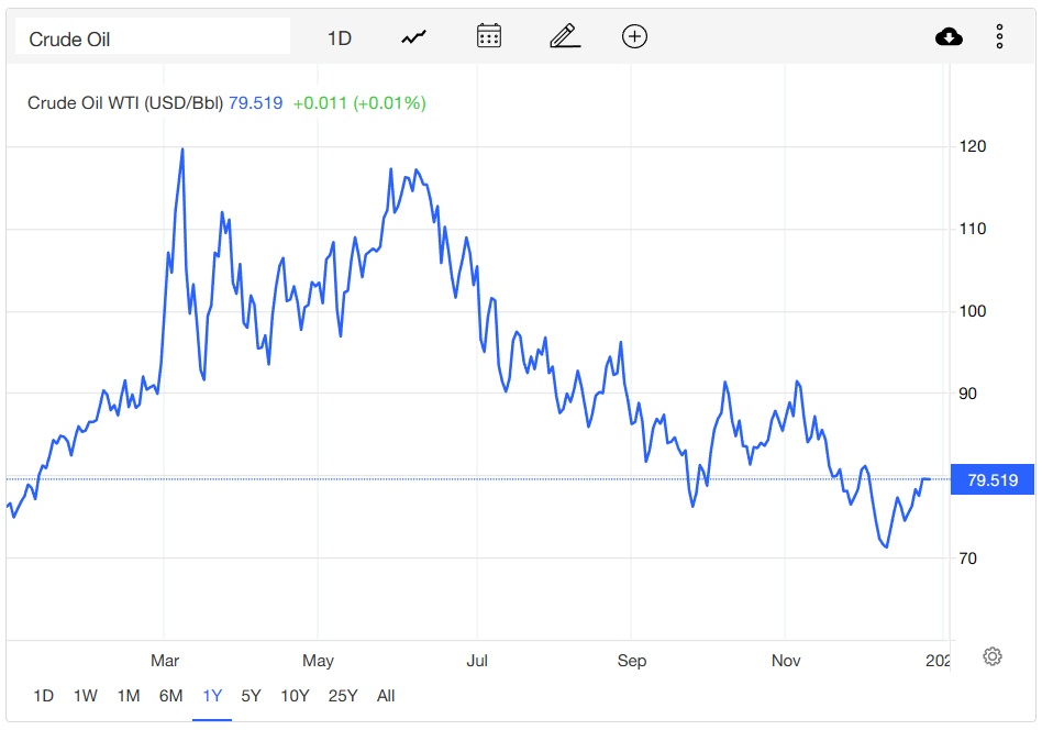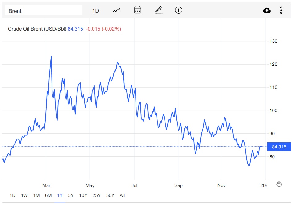 对全球经济增长放缓的担忧成为这一阶段主导油价回落的重要因素。油价在12月早些时候曾一度跌至近一年以来新低,并回吐了俄乌冲突以来的全部涨幅。美联储自今年3月至今累计加息425个基点,其中包括从6月开始的连续4次75个基点的加息,如此激进的货币政策紧缩步伐再加上欧洲严重的能源危机令市场对经济衰退的担忧升温,抵消了OPEC+大幅减产、美欧等国家对俄油设置价格上限等带来的推高油价的影响。另外,美联储大举加息之下,美元不断走高也是导致原油等以美元计价的大宗商品价格在这一阶段走低的因素之一。不过,在俄罗斯威胁将减产应对美欧等国家的限价措施之后,油价在近期有所上升。最新消息显示,普京于12月27日签署法令,禁止向对俄罗斯石油实施限价的国家出口石油,作为对西方“限价令”的反击。截至12月28日,布伦特原油位于84美元/桶附近,WTI原油则处于79美元/桶左右。