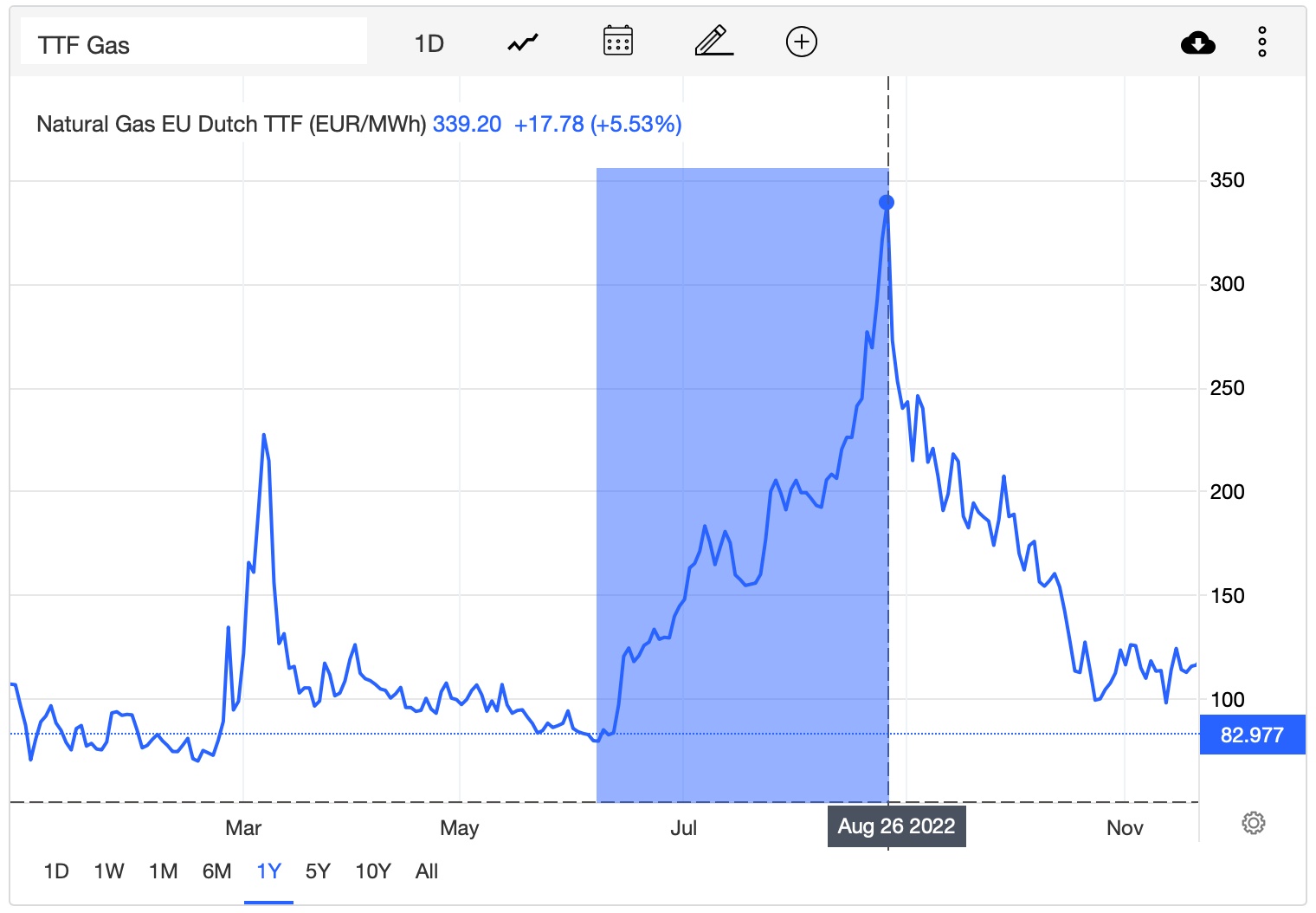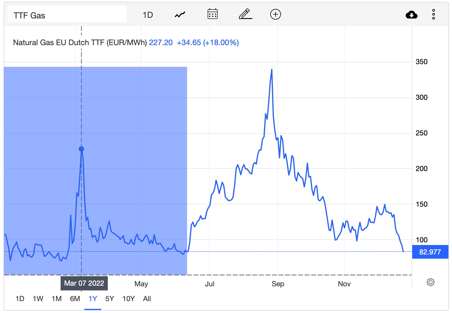 2022年迄今为止,欧洲天然气的表现可谓大起大落,基准荷兰TTF天然气期货价格走势大致可分为三个阶段: