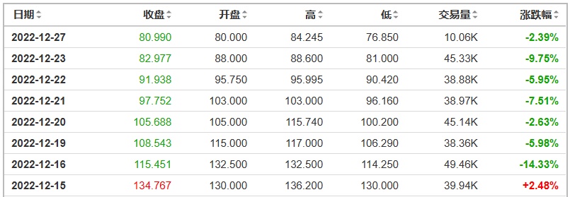 尽管在此期间“北溪一号”天然气管道发生泄露曾一度推动欧洲气价出现反弹,但未能改变其持续回落的趋势。截至12月27日,欧洲气价已连跌七日至81欧元/兆瓦时附近,为6月初以来最低水平,较8月份的创纪录高点下跌了75%以上,自12月11日以来的累计跌幅更是达到了37%以上。温和天气以及高库存水平是两个最主要的驱动因素。
