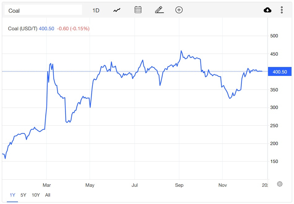 煤炭是2022年表现最好的大宗商品之一。受全球供应紧张和需求强劲推动,海外煤价基准纽卡斯尔动力煤期货价格目前处于400美元/吨上方,自今年年初以来上涨超过150%,且在今年9月曾涨至约458美元/吨的历史高点。