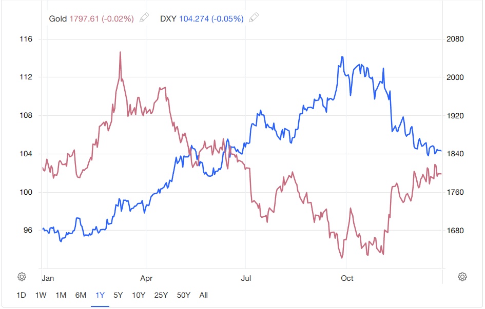受俄乌冲突和通胀压力加剧引发的避险情绪推动,金价自1月底开始一路走高并在3月8日达到2052.41美元/盎司的19个月以来高点。在这之后,随着美元在美联储日益强硬的立场下走强,金价持续承压,并在9月底跌至1617.1美元/盎司的年内低点。不过,随着市场对美联储放缓紧缩步伐的预期升温、以及对通胀高企和经济衰退的担忧日益加剧,黄金又重获青睐,金价自11月初以来便逐步走高,目前则徘徊在1800美元/盎司附近。