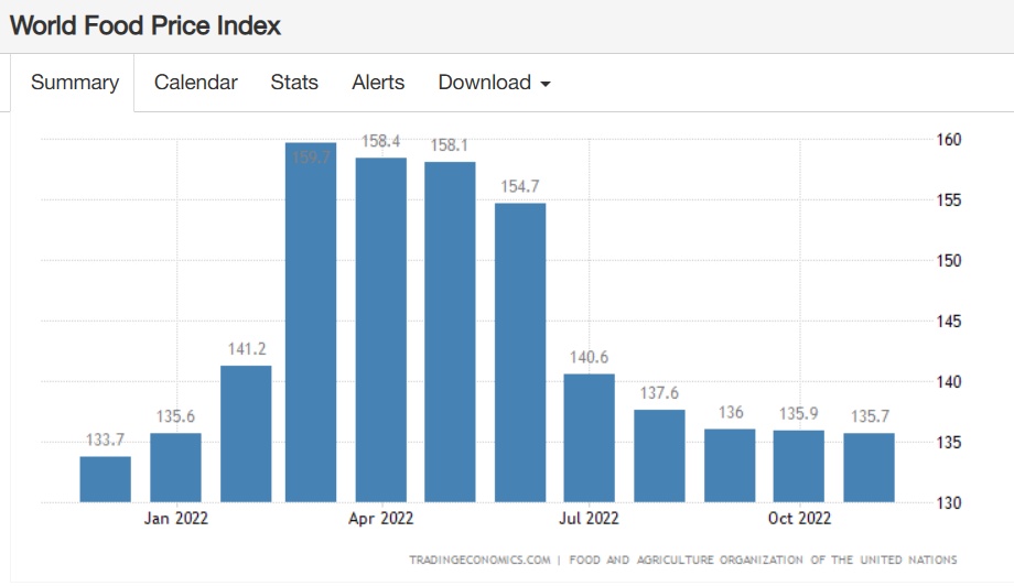 到了7月,随着俄罗斯、乌克兰就黑海港口粮食外运问题在土耳其伊斯坦布尔分别与土耳其和联合国签署相关协议,全球粮食供应紧张状况有所缓解,小麦、大豆等农作物价格也出现较大幅度回落。截至12月28日,芝加哥小麦期货价格为每蒲式耳7.75美元,芝加哥大豆期货价格为每蒲式耳14.95美元。此外,联合国粮食及农业组织(FAO)的粮食世界价格指数在11月份小幅下降,这是该指数自3月份俄乌冲突后创下的历史新高以来连续第八个月下降。值得注意的是,尽管有所回落,但全球粮食价格仍处于历史较高水平。