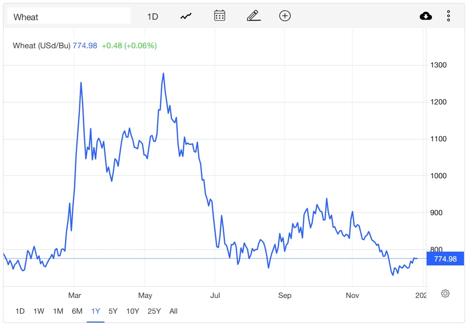 FAO指出,长期来看,导致更严重干旱和降水模式改变的气候变化和环境破坏是造成粮食减产的主要因素,而且不大可能在2023年得到有效缓解。FAO报告称,全球约有三分之一土壤退化,导致土壤肥力流失、谷物和果蔬营养质量下降。目前,全球小麦产量整体上正在下降,预计总产量为7.8059亿吨,比11月的预测低200万吨;主要小麦生产国家(阿根廷、澳大利亚、加拿大、欧盟国家、俄罗斯和乌克兰)的产量仅为3.287亿吨,而计划产量为3.308亿吨。此外,地缘政治风险上升也为全球粮食供应带来了短期冲击,俄乌局势如何发展尚不明朗,为黑海港口粮食外运带来了不确定性,并可能再度扰乱全球粮食供应。