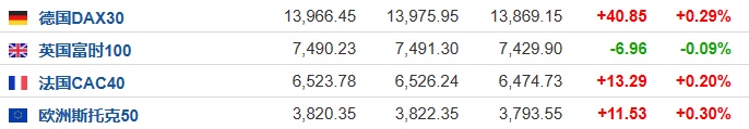 2. 截至发稿,德国DAX指数涨0.29%,英国富时100指数跌0.09%,法国CAC40指数涨0.20%,欧洲斯托克50指数涨0.30%。