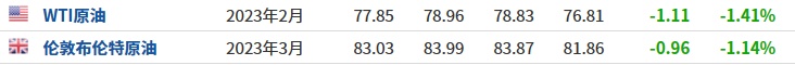 3. 截至发稿,WTI原油跌1.41%,报77.85美元/桶。布伦特原油跌1.14%,报83.03美元/桶。