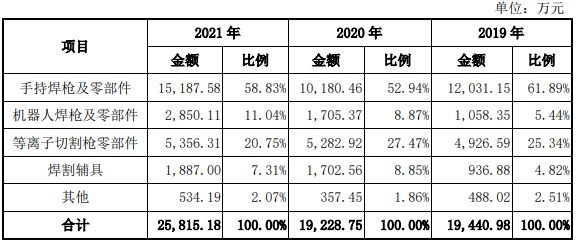 公司主要产品为焊割枪及零部件,产品包含焊接和切割两大类。其中,焊接类产品主要为手持焊枪及零部件和机器人焊枪及零部件,切割类产品主要为等离子切割枪零部件。公司产品品种丰富,具体产品型号达四千余种。报告期内,手持焊枪及零部件、机器人焊枪及零部件和等离子切割枪零部件系公司主要三类产品合计收入占主营业务收入的比例分别为 92.67%、89.28%和90.62%,基本保持稳定。