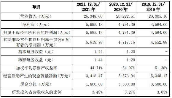 财务方面,于2019年度、2020年度以及2021年度,公司实现营业收入分别为2亿元、2.02亿元、2.63亿元。其中,归属于母公司所有者的净利润分别为4,564万元、4791.29万元、5995.13万元。