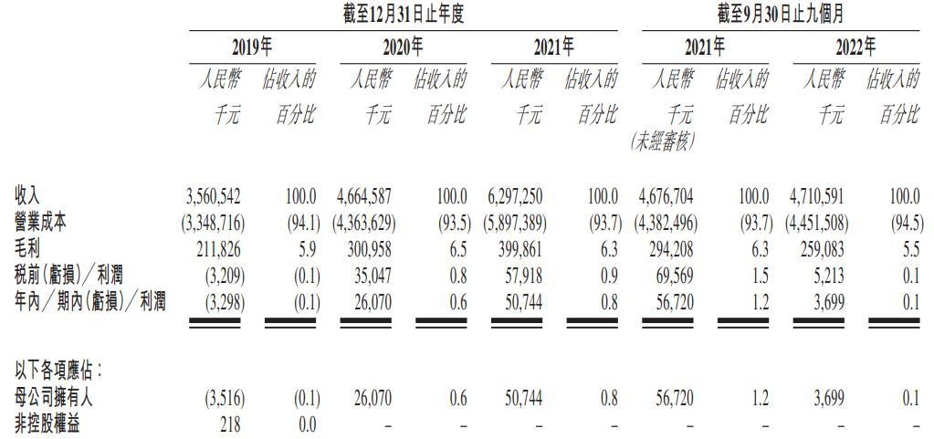 财务方面,于2019年、2020年、2021年及2022年前九个月,公司收入分别约为人民币(下同)35.61亿元、46.65亿元、62.97亿元及;47.11亿元;同期,毛利分别约为2.12亿元、3.01亿元、4.00亿元及、2.59亿元。