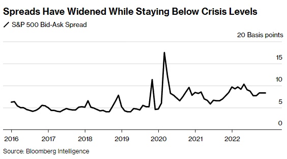 标准普尔500指数的买卖价差远未达到2020年抛售期间的水平,尽管它们尚未恢复到新冠疫情前的水平。这也是为什么接受采访的股票交易员们出人意料地乐观的原因之一。