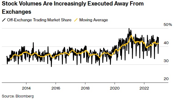 数据显示,虽然散户投机有所减弱,但今年平均42%的股票交易量是在场外完成的,而截至2019年的五年里这一比例为37%。所有这些都引发了这样一个问题:做市商之间对这些订单的竞争是否足够激烈?这似乎是美国证券交易委员会担心的事情。监管机构本月提出了旨在引导更多业务进入交易所的建议,但没有禁止所谓的“订单付款流”。