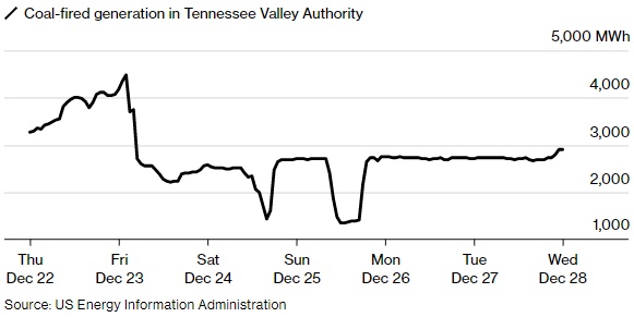 根据联邦数据显示,田纳西河谷管理局的燃煤电厂发电量从12月23日早些时候的逾4千兆瓦(gigawatts)下降了约68%,至12月24日的约1.5千兆瓦。尽管天然气发电量在12月23日有所增加,但在12月24日下降了约25%,从约11.5千兆瓦降至不足9千兆瓦,原因是该公司下令停电近6小时。