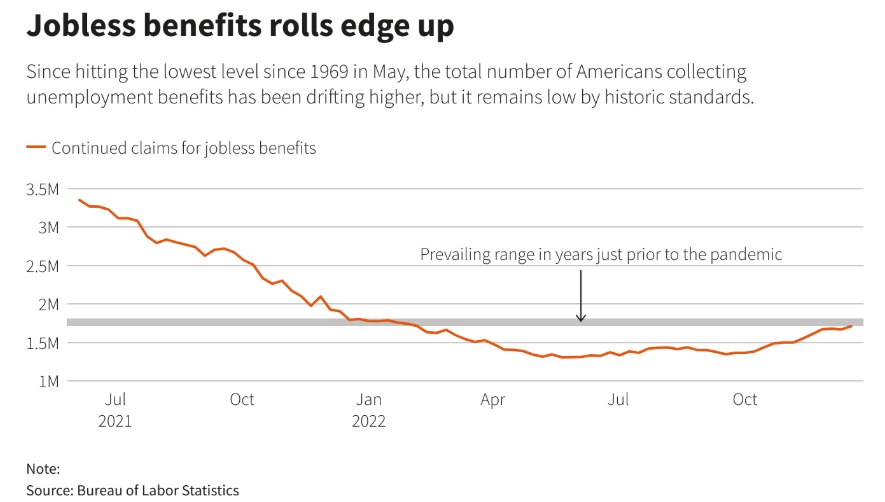 在5月份触及1969年以来的最低水平后,续请失业金人数自10月初以来一直在上升。而最新数字是自2月以来首次达到170-180万区间的下限,这一水平在疫情爆发前普遍被视为劳动力市场紧张的象征。