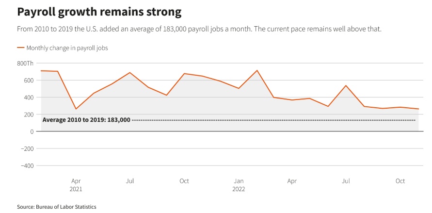事实上,就业市场的弹性一直是美联储决策者关注的焦点,因为尽管利率迅速上调,而且人们对明年经济衰退的担忧日益加剧,但美国经济今年平均每月新增就业岗位仍达到39.2万个。截至10月,每一名失业人员对应约1.7个职位空缺,这一比例大约比疫情前的水平高出0.5个百分点。