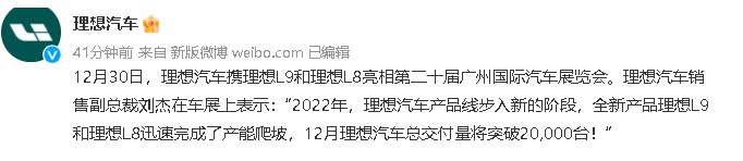 智通财经APP获悉,12月30日,第一家月交付量突破2万台的造车新势力即将诞生。据理想汽车-W(02015)微博消息,理想汽车今日携理想L9和理想L8亮相第二十届广州国际汽车展览会。理想汽车销售副总裁刘杰在车展上表示:“2022年,理想汽车产品线步入新的阶段,全新产品理想L9和理想L8迅速完成了产能爬坡,12月理想汽车总交付量将突破20000台。”