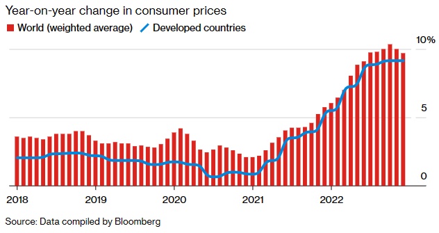 全球通胀飙升导致一些主要经济体的通胀率达到了两位数。经济学家认为,这是由疫情对供应链和劳动力市场的破坏、俄乌冲突爆发后大宗商品价格飙升以及政府为提振消费者支出而实施的刺激措施这些因素共同推动的。