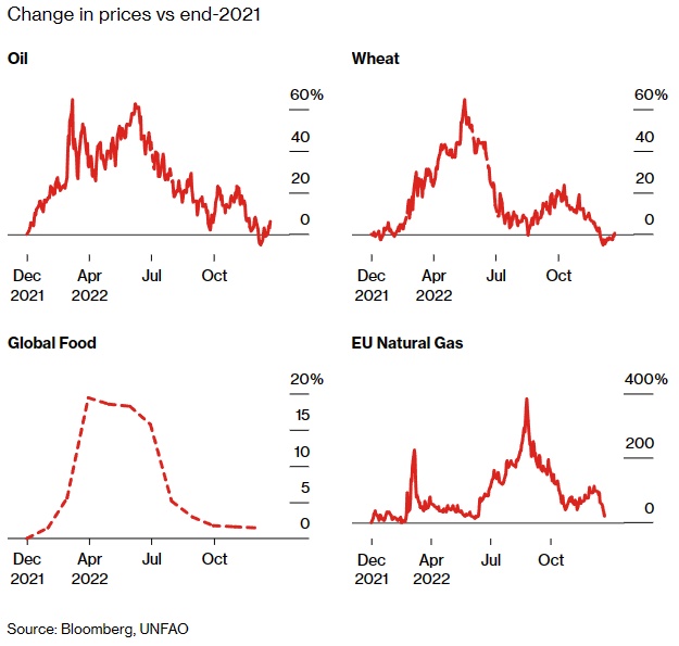 俄乌冲突于今年2月爆发、以及随后以美欧为首的西方国家对俄罗斯实施的大规模制裁,引发了从石油到小麦等关键大宗商品的价格飙升。依赖粮食和能源进口的贫穷国家受到的打击尤其严重,比如已经破产的斯里兰卡。在冲突前对俄罗斯天然气十分依赖的欧洲同样受到冲击,天然气价格及电力价格一度飙升至创纪录水平。不过,到年底,石油、天然气等一些大宗商品的价格已出现回落。