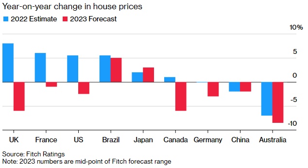 在经历了疫情期间的上涨之后,一些国家的房价在2022年开始下跌。许多分析师预计,由于高利率导致抵押贷款变得昂贵,明年将出现更广泛的房地产泡沫破裂。这对经济增长来说是一个风险。