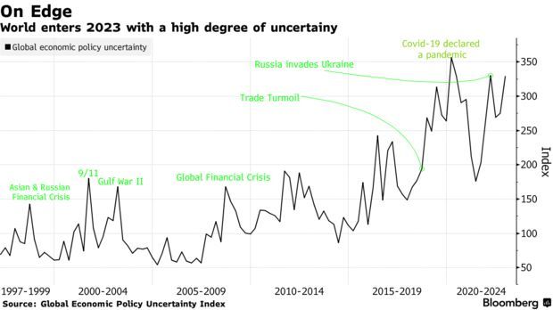 在2022年底,全球经济的一个显著特征是,很难看到接下来会发生什么。从疫情到俄乌冲突,衡量全球经济政策不确定性的一个指标正处于有记录以来的高水平。这表明,任何试图弄清楚过去一年的趋势将如何延续到2023年的人都应该保持谨慎。