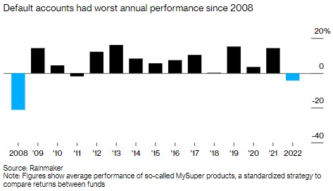 Group的数据显示,被称为MySuper的养老金账户的资产下降了4.3%,是2008年全球金融危机以来的最差表现。回报率受到固定收益资产的拖累,随着全球央行大举加息以抗击通胀,固定收益类资产的价值缩水。