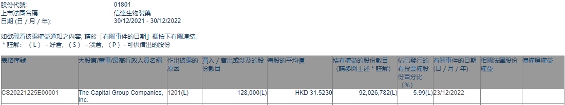 智通财经APP获悉,香港联交所最新资料显示,12月23日,The Capital Group Companies, Inc.减持信达生物(01801)12.8万股,每股作价31.523港元,总金额约为403.49万港元。减持后最新持股数目约为9202.68万股,最新持股比例为5.99%。