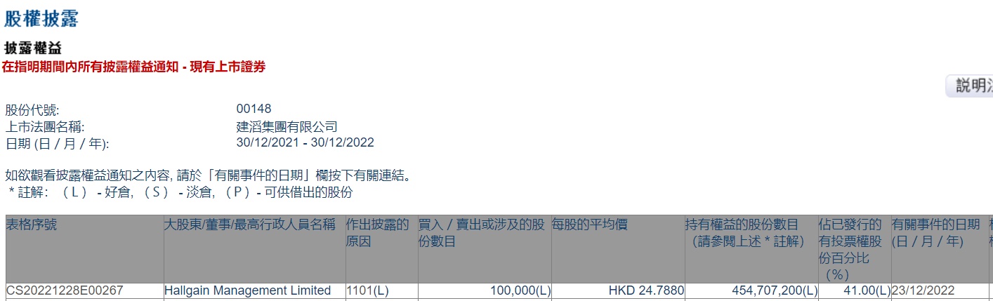 智通财经APP获悉,香港联交所最新资料显示,12月23日,Hallgain Management Limited增持建滔集团(00148)10万股,每股作价24.788港元,总金额约为247.88万港元。增持后最新持股数目约为4.55亿股,最新持股比例为41%。