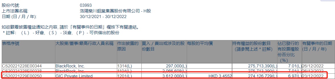 智通财经APP获悉,香港联交所最新资料显示,12月23日,GIC Private Limited减持洛阳钼业(03993)361.2万股,每股作价3.4552港元,总金额约为1248.02万港元。减持后最新持股数目约为2.74亿股,最新持股比例为6.97%。
