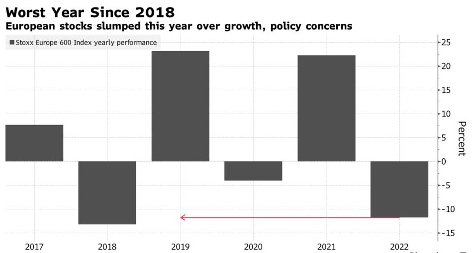 智通财经APP获悉,受俄乌战争引发的经济放缓以及欧洲央行大举收紧政策的影响,欧洲股市有望创下2018年以来最糟糕的年度表现。截至发稿,斯托克600指数下跌0.5%,今年跌幅达到12%。受假期影响,本周交易量低于平均水平,英国和德国市场于周五将提前休市。在2022年,欧洲股票投资者不得不努力应对价格飙升、鹰派货币政策、俄罗斯入侵乌克兰的后果以及持续能源危机的影响。尽管如此,欧洲股市今年的表现仍优于美国股市,这得益于第四季度的反弹,投资者希望通胀降温将动摇欧盟各国央行。
