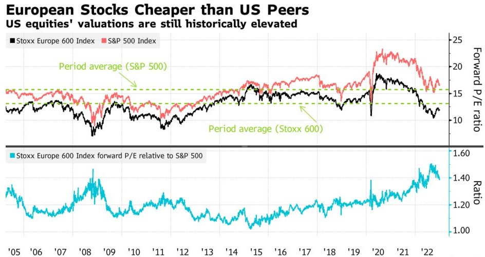 较低的估值也支撑了欧洲股市——今年早些时候,斯托克600指数相对于美国股市的价格处于自媒体2005年开始跟踪该数据以来的最低水平。这一欧洲基准股指的预期市盈率为12倍,低于2005年以来的平均估值水平,而美国股市则高于同期平均估值水平。