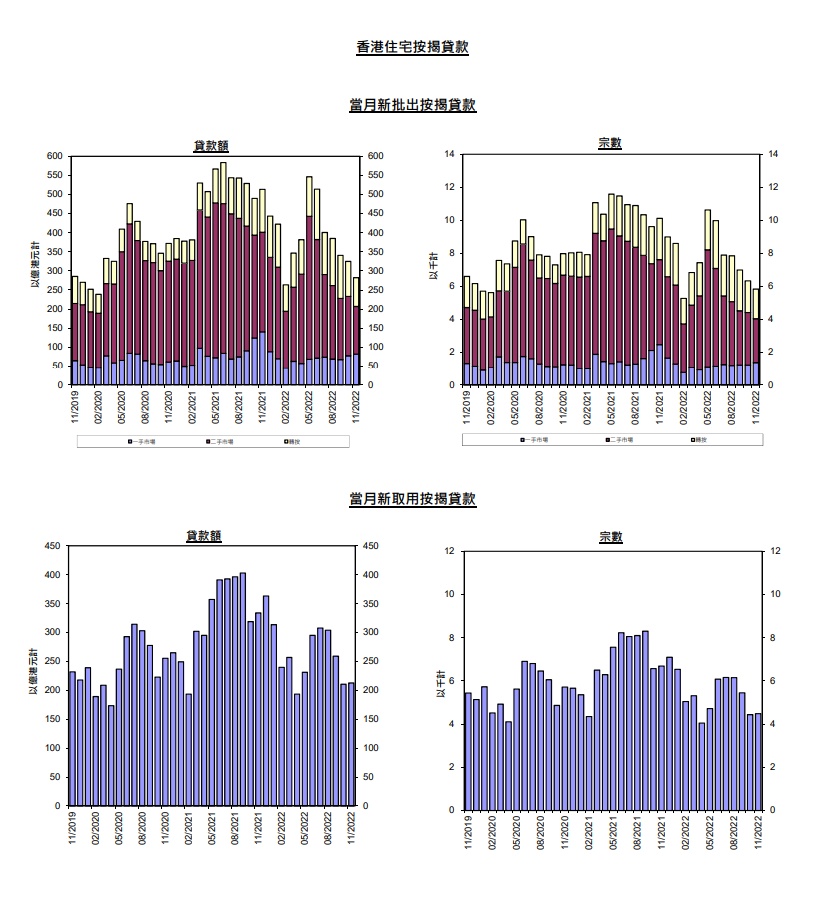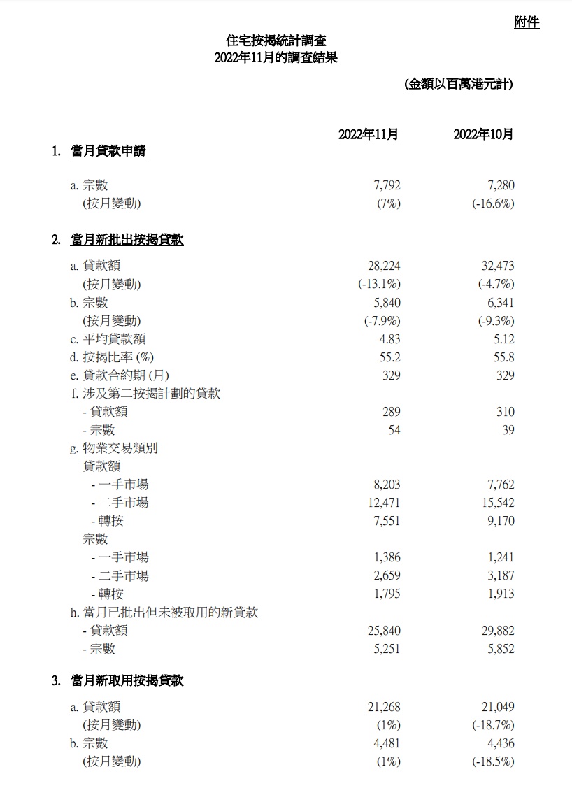 智通财经APP获悉,12月30日,香港金融管理局公布2022年10月份的住宅按揭统计调查结果。11月份新申请贷款个案较10月份按月增加7%,至7,792宗。11月份新批出的按揭贷款额较10月份减少13.1%,至282亿港元。当中,涉及一手市场交易所批出的贷款增加5.7%,至82亿港元;涉及二手市场交易所批出的贷款减少19.8%,至125亿港元。至于涉及转按交易所批出的贷款,则减少17.7%,至76亿港元。