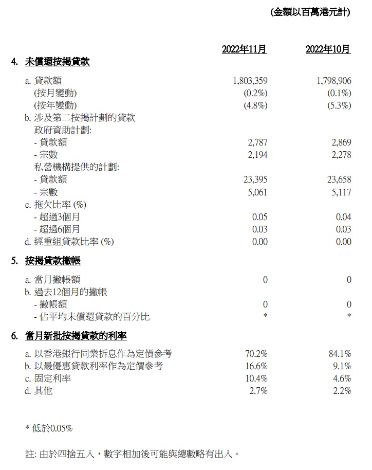 11月份新取用按揭贷款额较10月份增加1%,至213亿港元。以香港银行同业拆息作为定价参考的新批按揭贷款所占比例,由10月份的84.1%下降至11月份的70.2%。以最优惠贷款利率作为定价的新批按揭贷款所占比例,由10月份的9.1%上升至11月份的16.6%。11月底未偿还按揭贷款总额按月增加0.2 %,至18,034亿港元。按揭贷款拖欠比率轻微上升至0.05%,经重组贷款比率维持于接近0%。