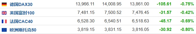 2. 截至发稿,德国DAX指数跌0.75%,英国富时100指数跌0.42%,法国CAC40指数跌0.69%,欧洲斯托克50指数跌0.80%。