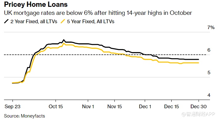 智通财经APP获悉,根据Moneyfacts Group Plc的数据,周五,英国2年期固定利率住房贷款平均利率为5.79%,过去三周利率徘徊在5.8%的水平。该利率在10月20日跃升至6.65%的14年高点,当时时任首相利兹·特拉斯的迷你预算导致利率螺旋式上升。英国5年期固定利率住房贷款的平均利率维持在5.63%,10月曾达到6.5%以上的高点。