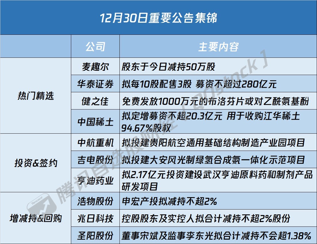 1、八连板麦趣尔回复关注函:股东于12月30日减持50万股