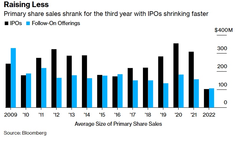 有统计数据显示,后续发行的平均规模也从2021年的1.56亿美元降至1.06亿美元。这反映出规模较小的上市公司在艰难的一年里迫切需要筹集现金,它们通常既缺乏大公司的现金储备,也无法获得为上市前初创公司提供资金的私人资本支撑。