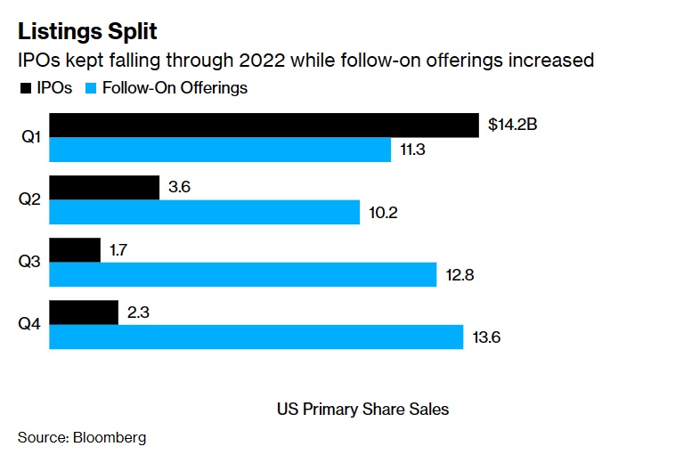 随着2023年的临近,回首2022年IPO筹集的大部分资金都集中在第一季度。相比之下,增发新股的规模保持稳定,并且在今年第四季度创下新高。