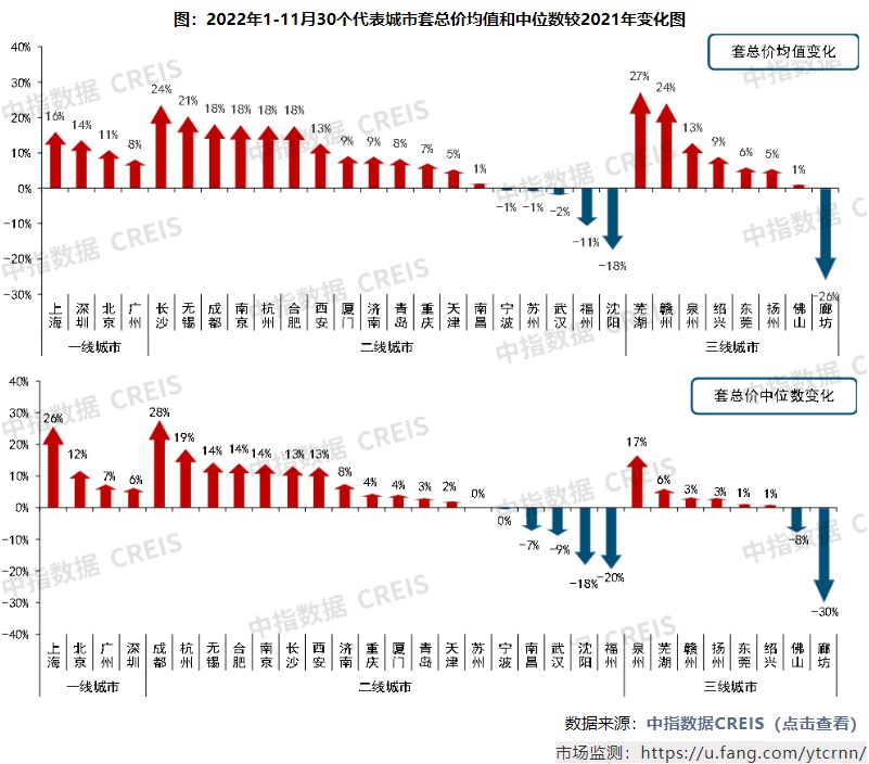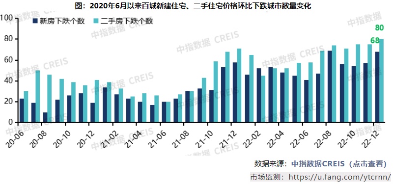 从涨跌城市个数看,2022年以来,百城新建住宅、二手住宅价格月度环比下跌城市数量均维持在高位水平,二手住宅价格环比下跌城市数量整体呈上升态势。12月,百城新建住宅价格环比下跌城市数量为68个,较2021年同期增加10个;百城二手住宅价格环比下跌城市数量增至80个,已连续5个月超70个。从累计下跌城市数量来看,2022年新建住宅价格累计下跌的城市有70个,二手住宅价格累计下跌的城市有73个。
