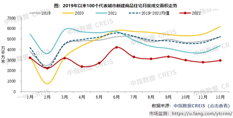 2022年,重点100城新建商品住宅成交面积同比降幅近四成,绝对规模为2015年以来最低水平。据初步统计,2022年,100个代表城市新建商品住宅月均成交面积约3036万平方米,同比下降36.2%。具体来看,上半年,市场延续调整态势,重点100城商品住宅月均成交面积同比下降43.8%。5-6月,疫情影响逐渐弱化叠加热点城市优化政策效果显现,市场表现边际修复。三季度,受季节性和部分城市“断供”项目增加等因素影响,市场成交活跃度再次下行,重点城市商品住宅月均成交面积同比下降26.8%;四季度,购房者置业情绪仍处低位,12月重点城市成交面积环比小幅回升,但同比降幅仍超三成,单月已连续19个月同比下降,市场预期依然较弱。