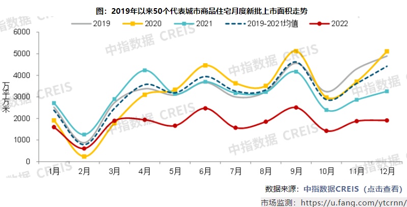 2022年,50个代表城市商品住宅新批上市面积同比下降超四成,市场销售疲软叠加部分城市疫情封控影响,房企推盘节奏放缓。据初步统计,2022年,50个代表城市商品住宅月均新批上市面积约1779万平方米,处2015年以来最低水平,同比下降超40%。具体来看,上半年重点城市供应端明显走弱,新批上市面积同比降幅超四成,6月房企积极推盘抢收回款,代表城市新批上市面积环比增长48.3%,同比降幅收窄超10个百分点。三季度房企推盘意愿再次走弱,新批上市面积同比下降43.9%。进入11月,在冲刺全年业绩目标下,房企加快项目供货节奏,50个代表城市新批上市面积环比有所增长。12月疫情形势愈发严峻,拖累房企供货节奏,新批上市面积同比降幅仍较大。