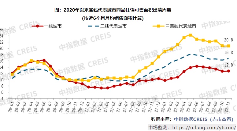 短期库存来看,50个代表城市可售面积处在相对高位,出清周期为17.2个月。截至2022年11月末,50个代表城市商品住宅可售面积约37445万平方米,供需两端均偏弱的情形下,重点城市可售面积处于2017年以来的相对高位,较2021年末下降3.9%。出清周期方面,截至11月末,按近6个月月均销售面积计算,短期库存出清周期为17.2个月,较2021年末延长3.4个月,其中三四线代表城市出清周期为20.8个月,市场库存去化压力较大。