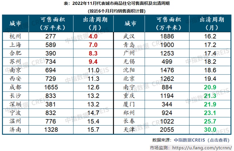 整体来看,2022年,重点城市商品住宅供求面积均为2015年以来最低水平,房企推盘积极性不足。供需两端均弱下,重点城市可售面积处在相对高位,仅少数核心一二线城市短期库存去化时间不足10个月,三四线城市库存去化压力较大。