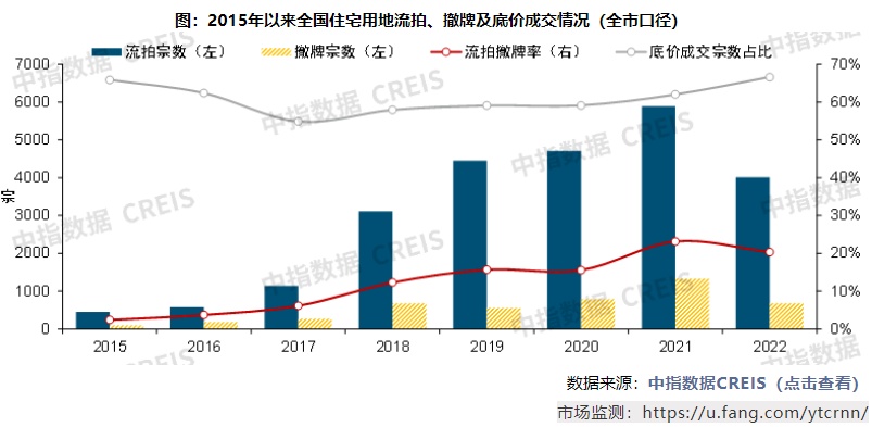 流拍撤牌方面,全国住宅用地流拍、撤牌数量均处近五年同期最低位,但流拍撤牌率仍较高。一方面,市场低迷下政府推地谨慎,推出宗数较去年缩量明显;另一方面,2022年以来,全国各地持续优化土拍规则、释放优质地块,提高房企参拍积极性,且在土地公告前期,部分城市地方政府亦提前摸排,以改善流拍撤牌情况,但各地土地市场情绪仍普遍偏低,流拍撤牌率仍在高位。据初步统计,2022年,全国流拍地块数量共计4006宗,撤牌672宗,流拍撤牌率20.3%,较去年同期下调2.8个百分点,仍在高位。