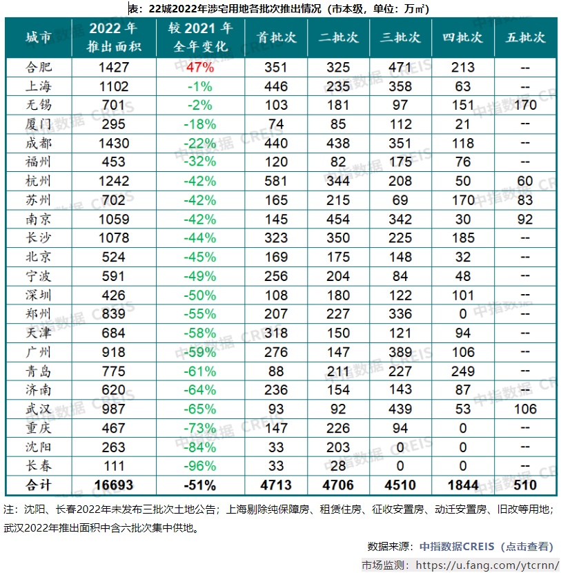 22城土地推出批次较去年增加,多城已供四批次,但推出规模缩减。据初步统计,2022年,22城累计推出规模较2021年下降超五成,除合肥外,其余城市推出规模明显缩量,青岛、武汉、重庆、沈阳降幅均超六成。