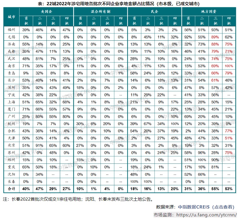 表:22城2022年涉宅用地各批次不同企业拿地金额占比情况(市本级,已成交城市)注:长春2022首批次仅成交1宗住宅用地;沈阳、长春未发布三批次土地公告。