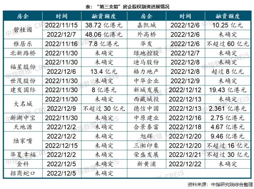 11月28日,证监会新闻发言人透露在上市房企股权融资方面调整优化5项措施,“第三支箭”股权融资正式落地,明确恢复涉房上市公司并购重组及配套融资,恢复上市房企和涉房上市公司再融资等。12月,证监会指出“允许符合条件的房企‘借壳’已上市房企”。此前部分房企已宣布拟配股筹资,预计后续相关配套政策将持续推出和完善。
