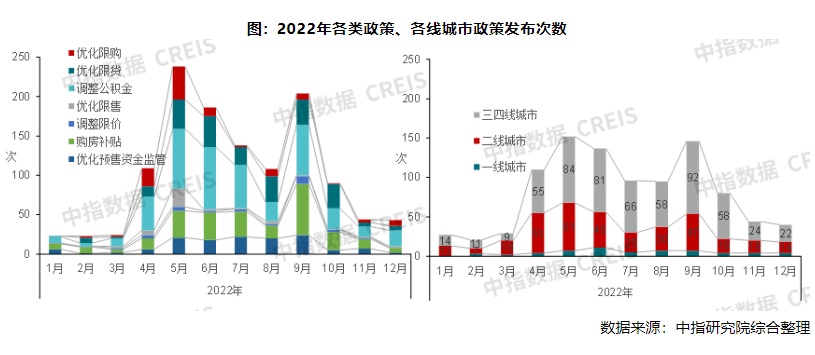 地方层面,根据中指监测,2022年,已有超300省市(县)出台政策超千条,达到近年峰值。从政策优化节奏来看,4月以来政策进入实质性宽松期,政策节奏加快和力度明显加大,且城市不断向热点二线城市扩围;下半年开始各地因城施策频率稍缓,9月政策优化节奏有所加快,热点城市加大优化力度。四季度,各线城市政策继续优化的空间有限,政策调控频次有所放缓。