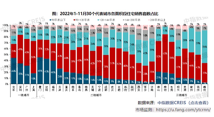从面积段成交套数占比来看,与2021年相比,30个代表城市中,22个城市120-144平方米成交套数占比有所增长,25个城市144-200平方米和23个城市200平方米以上大户型成交套数占比均有一定提升。另外,21个城市90平米以下面积段产品成交占比下降,刚需群体购房意愿进一步走低,刚需产品表现整体较2021年明显转弱。