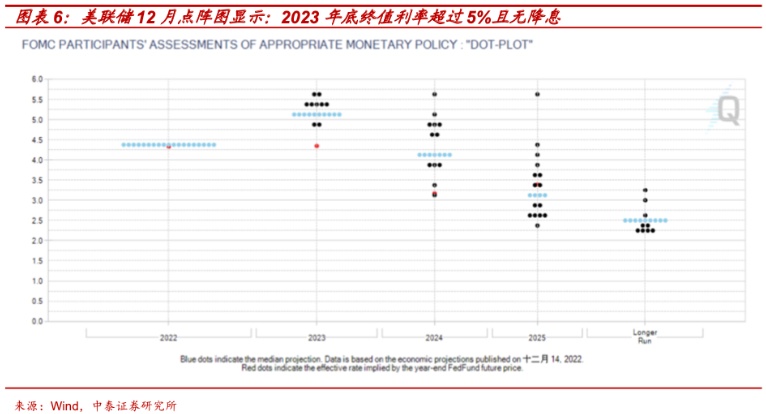 在美联储控制通胀的框架之内,2023年上半年将利率的终值和高位持续的时间均比市场预期的更加鹰派,驱动经济与通胀加速回落,或直至2024年通胀控制住了之后再重新刺激。事实上,12月美联储议息会议与各个票委的表态,也均呈现出这一观点:终值利率的高度与持续时间超市场预期。