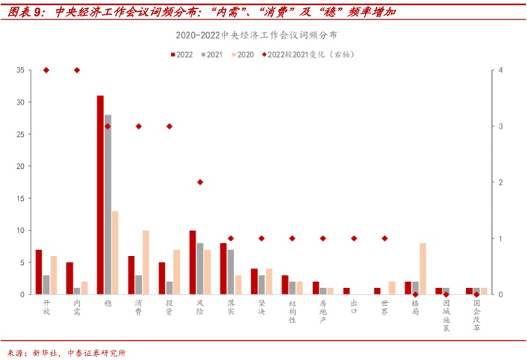 2022年四季度以来,疫情,地产救助等政策出现较大程度的变化,引发了市场大幅波动。需要注意的是,上述政策变化的核心原因在于管理层出于社会、经济及民生稳定的大局。基于这一逻辑,结合年底政治局会议,中央经济工作会议看出,2023年的政策基调在于注重人民性/供应链安全的改革与政府主导定向刺激超预期并重。